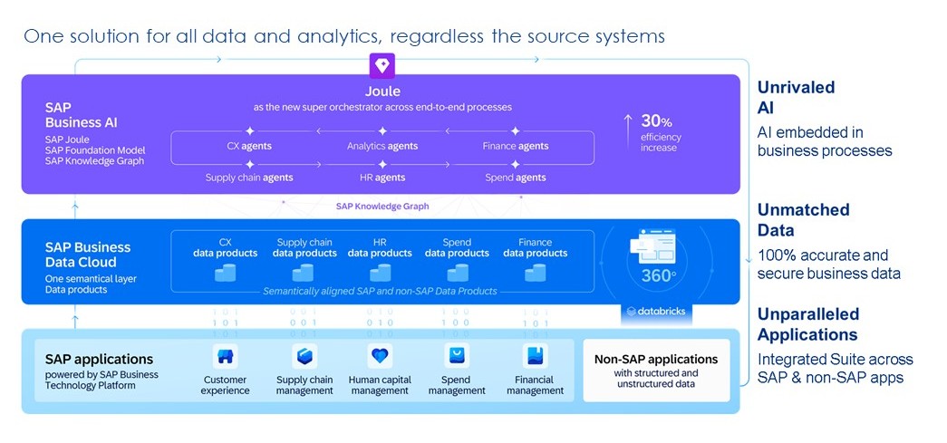 This setup works with SAP systems like S/4HANA, Ariba, and SuccessFactors, so organizations can start analyzing trusted data right away.