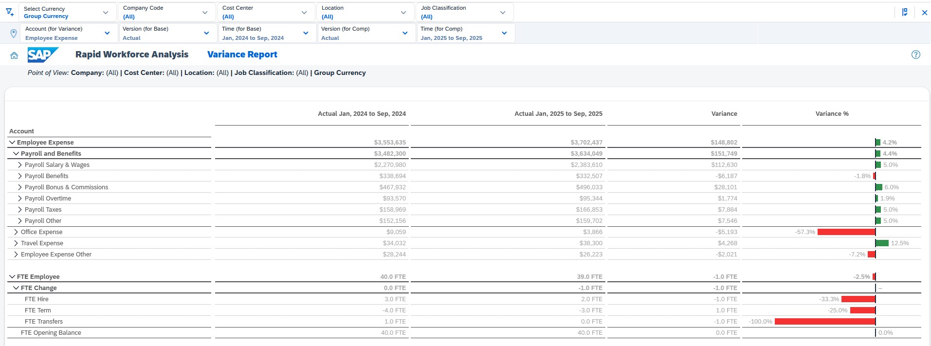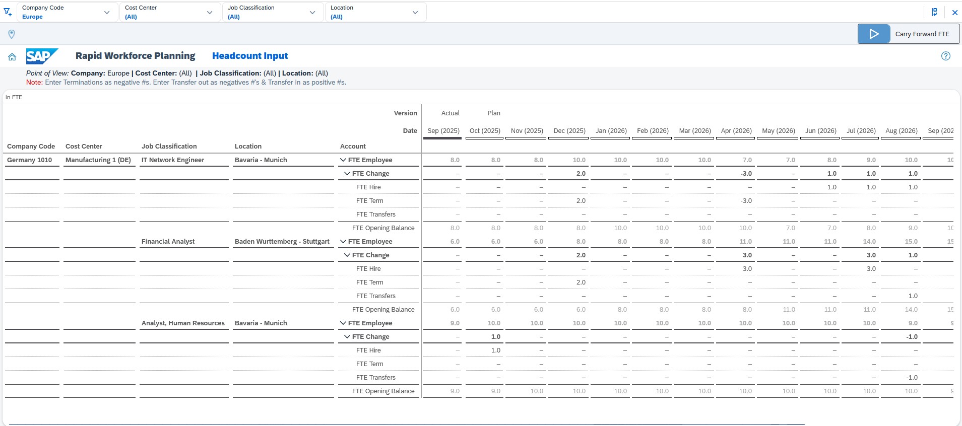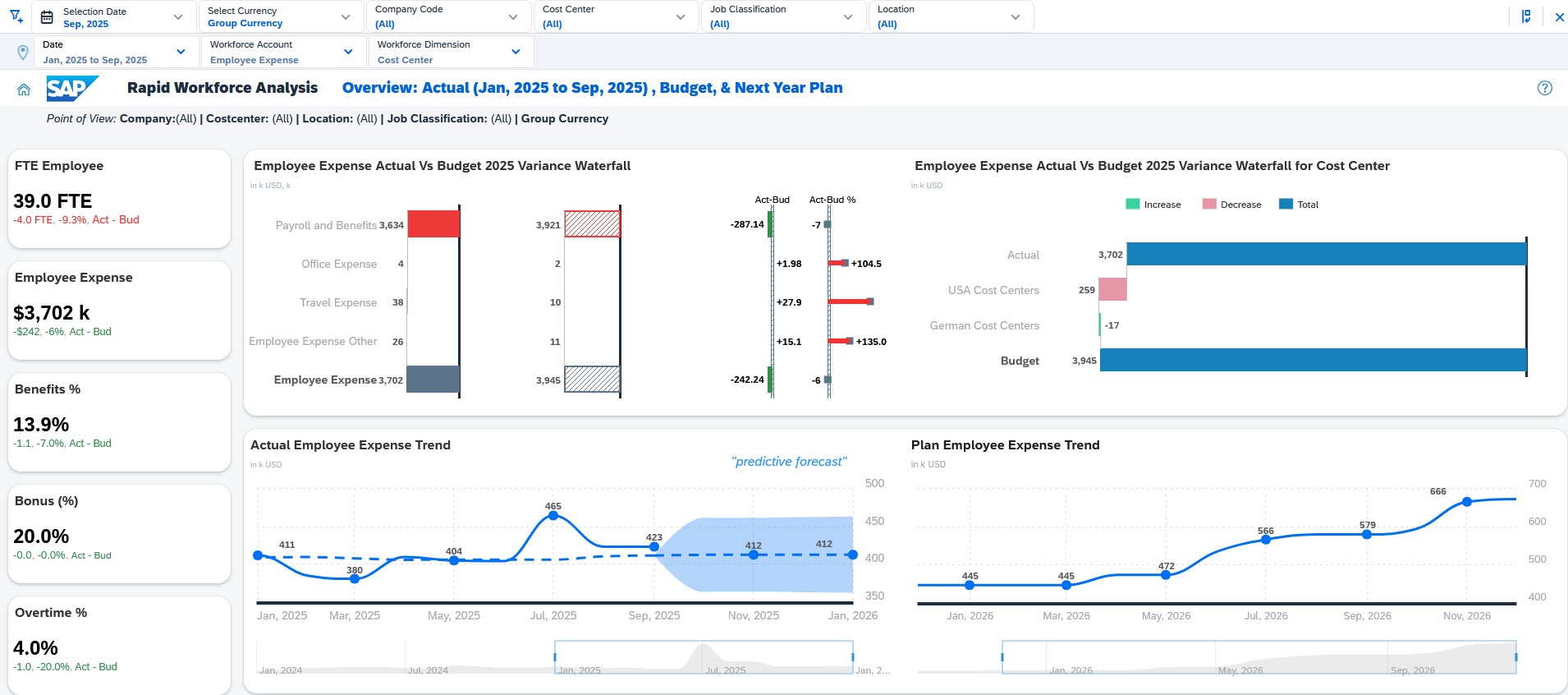 The system considers base salary, bonuses, employer taxes, benefits, training, travel expenses, and office expenses. In the event of a change in the employee's status, such as a new hire, promotion, transfer, or termination, SAC automatically recalculates the employee's cost, allocates the expenses to the appropriate cost center, and updates the financial plan. Calculations are performed using standard SAP Enterprise Planning mechanisms, including planning models, data actions, allocations, and predictive forecasting.