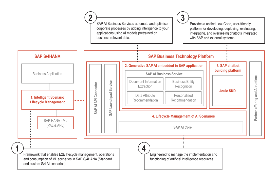 AI is embedded directly into SAP S/4HANA processes, enhancing daily operations. SAP BTP provides services for building and extending AI use cases – including document processing, recommendation services, generative AI capabilities, and chatbot development.